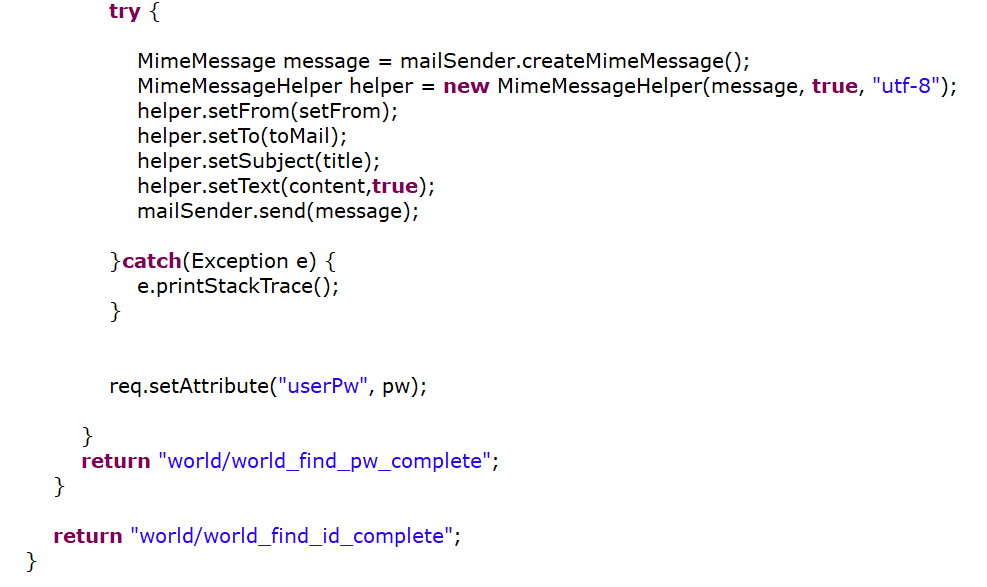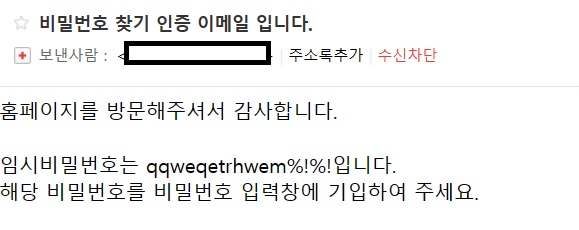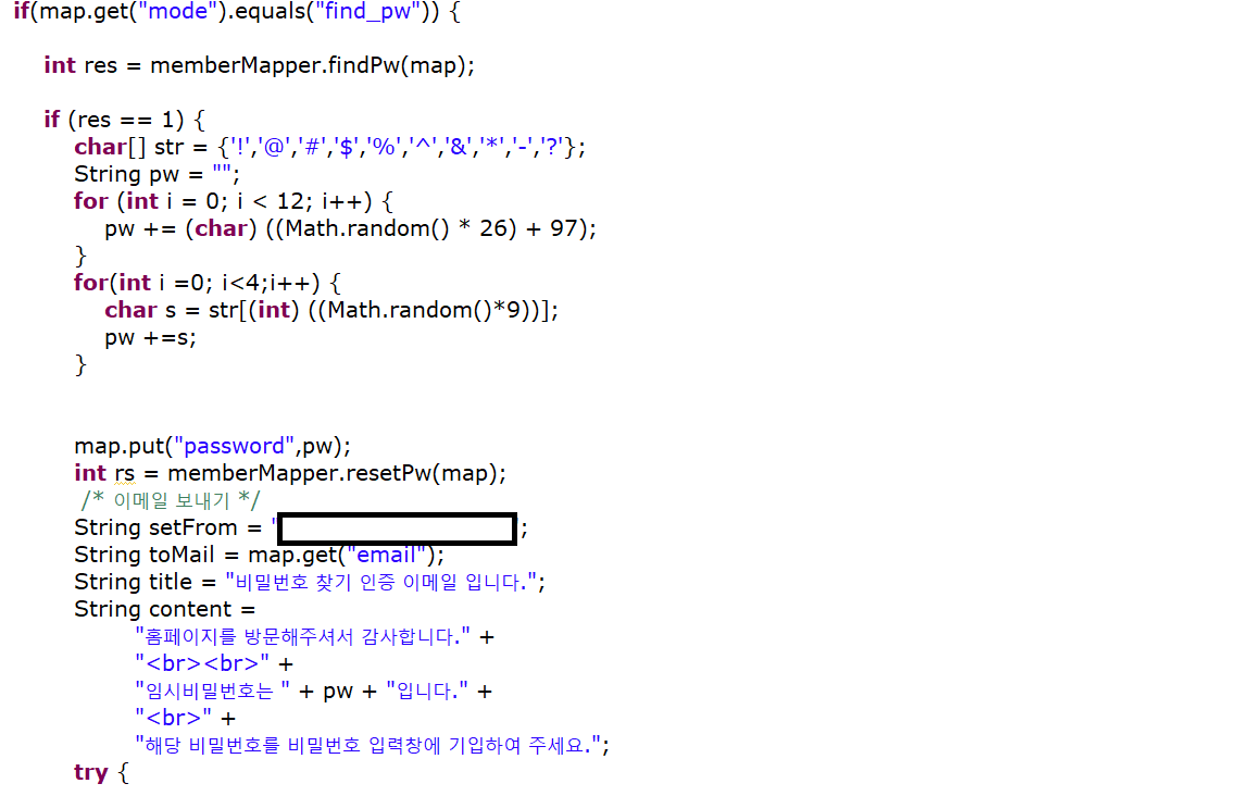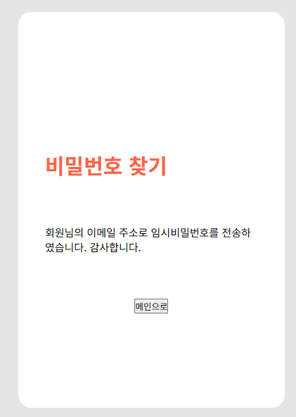 사용자가 아이디 또는 비밀번호를 분실할수 있고, 웹페이지의 기본적인 부분이기때문에 이부분은 반드시 구현이 필요했다. 국비학원에서 구현하였던 naver 이메일을 통한 임시 비밀번호 발송 기능을 구현하였다.