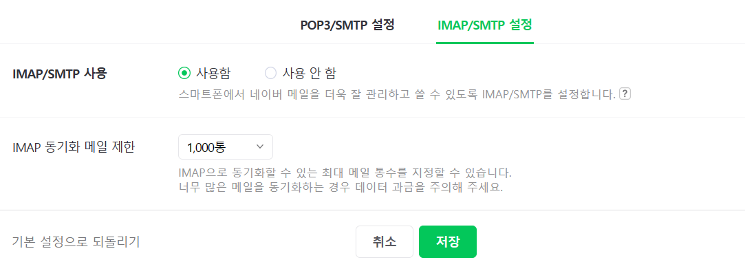 본인 네이버 계정으로 로그인한뒤, 메일부분에 환경설정에 들어가 아래와같이 설정해두어야 한다.