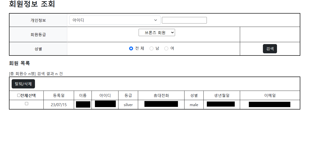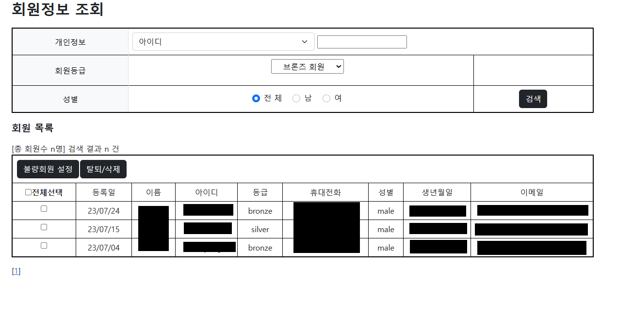 상품목록페이지와 마찬가지로, 회원도 불량회원과 일반회원을 구분짓기위해서 ajax를 사용한 체크박스로 페이지를 넘기도록 구현하였으며, 회원같은경우는 검색할때 개인정보 옵션값과 그에따른 회원등급, 성별에 따라 검색이 될수 있게끔 구현하였다.