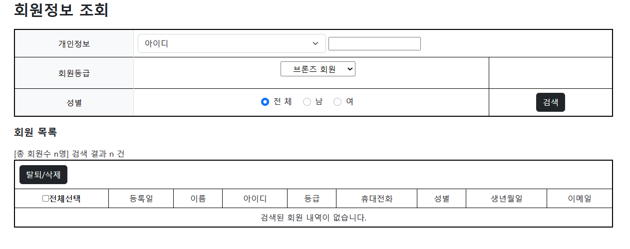 이와 같이 검색된 회원 내역이 없습니다 라는 문구가 나오게된다.
