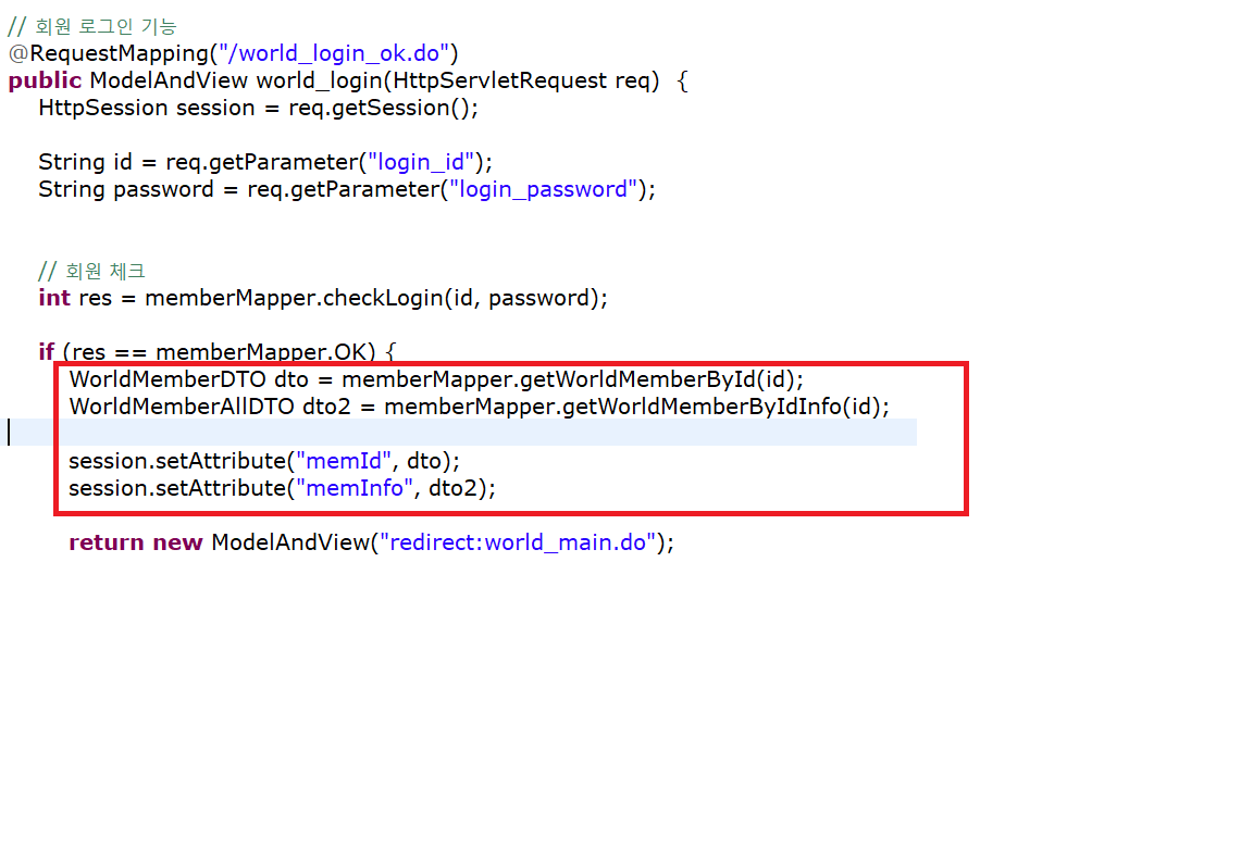 보이다시피 로그인한 이후의 id값이 세션으로 남아있어야 해서 해당값은 dto라는 이름으로 세션에담아