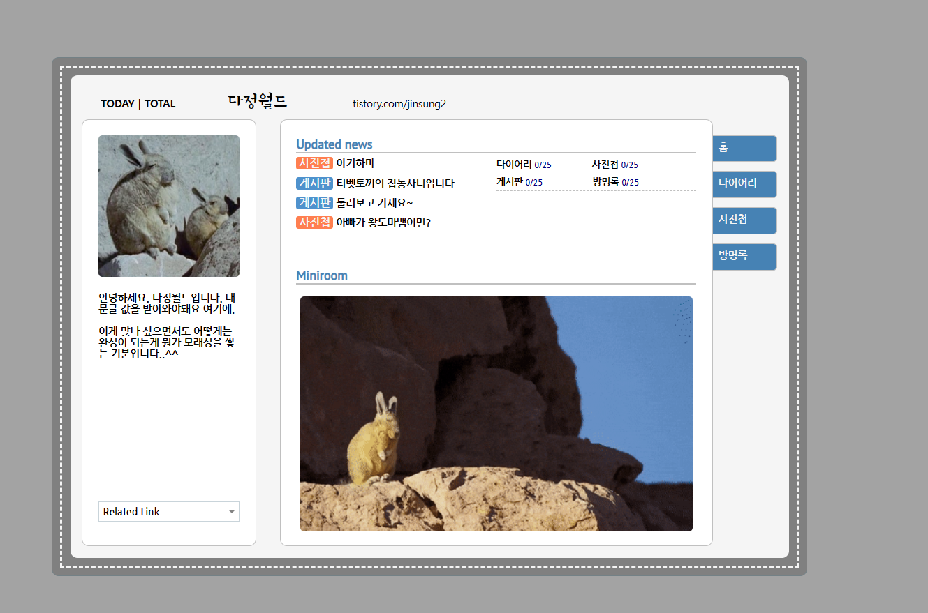 상단에있는 대문글이나 업데이트 뉴스, 미니룸 부분(구현이힘들경우 저런식으로 사진으로 대체할것같다. 아니면 다른기능을 추가하는식으로..) 전부 값들을 받아올것이다.
